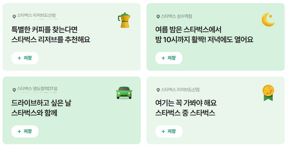 (예: 야경 좋은 매장, 리저브, 드라이브 스루, 콘센트 많은 매장 등 15개 테마 제공) - 마음에 드는 매장 1개 이상 저장